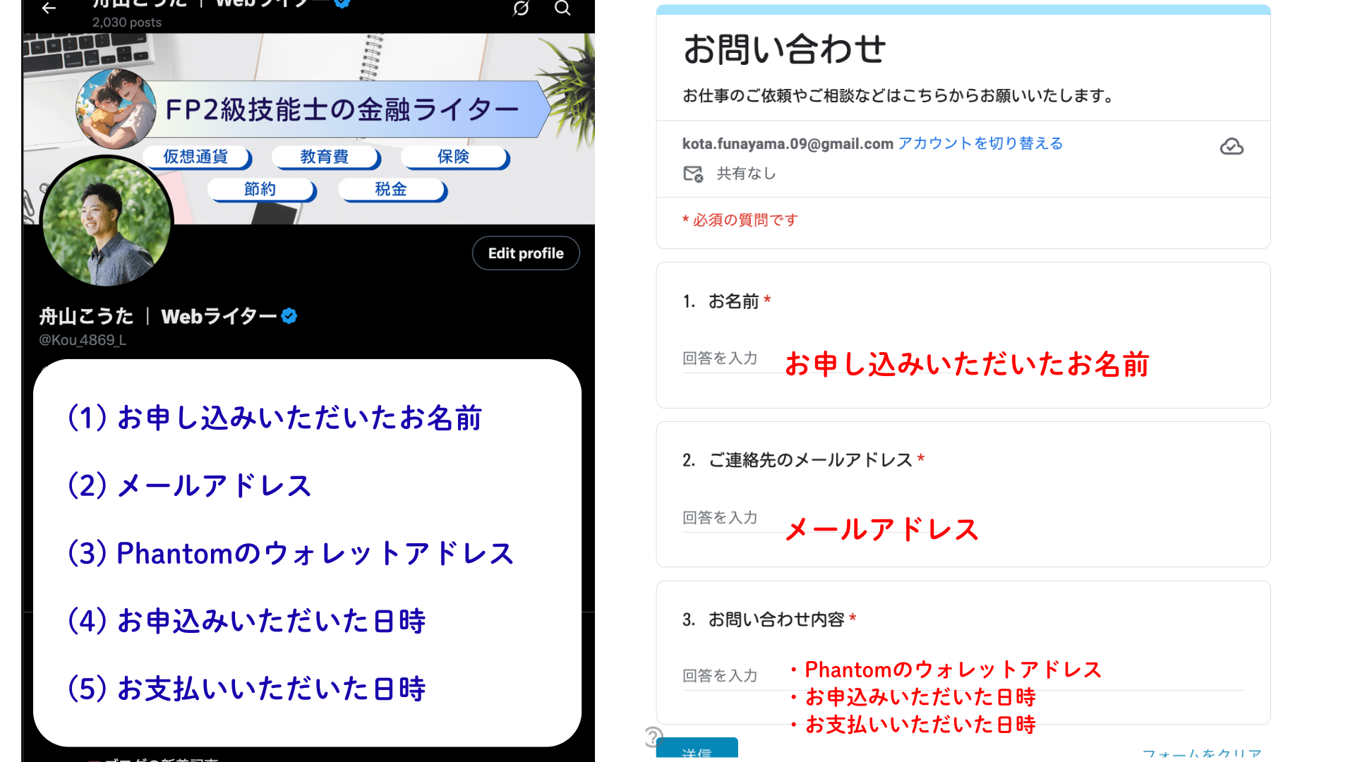 - X ( 旧Twitter )のDMもしくはお問い合わせでウォレットアドレスを送付する。